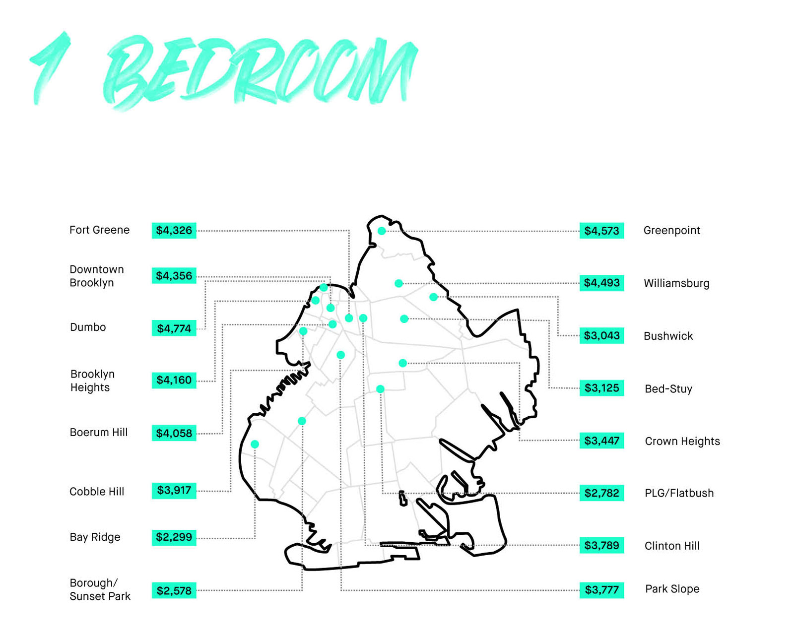 | One bedrooms | Dumbo $4,774 | Bay Ridge $2,299 |