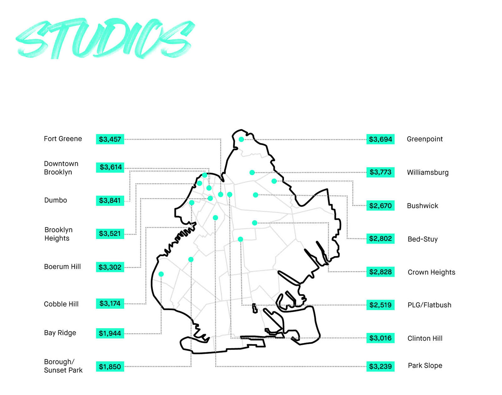 | Studios | Dumbo $3,841 | Borough Park / Sunset Park $1,850 |