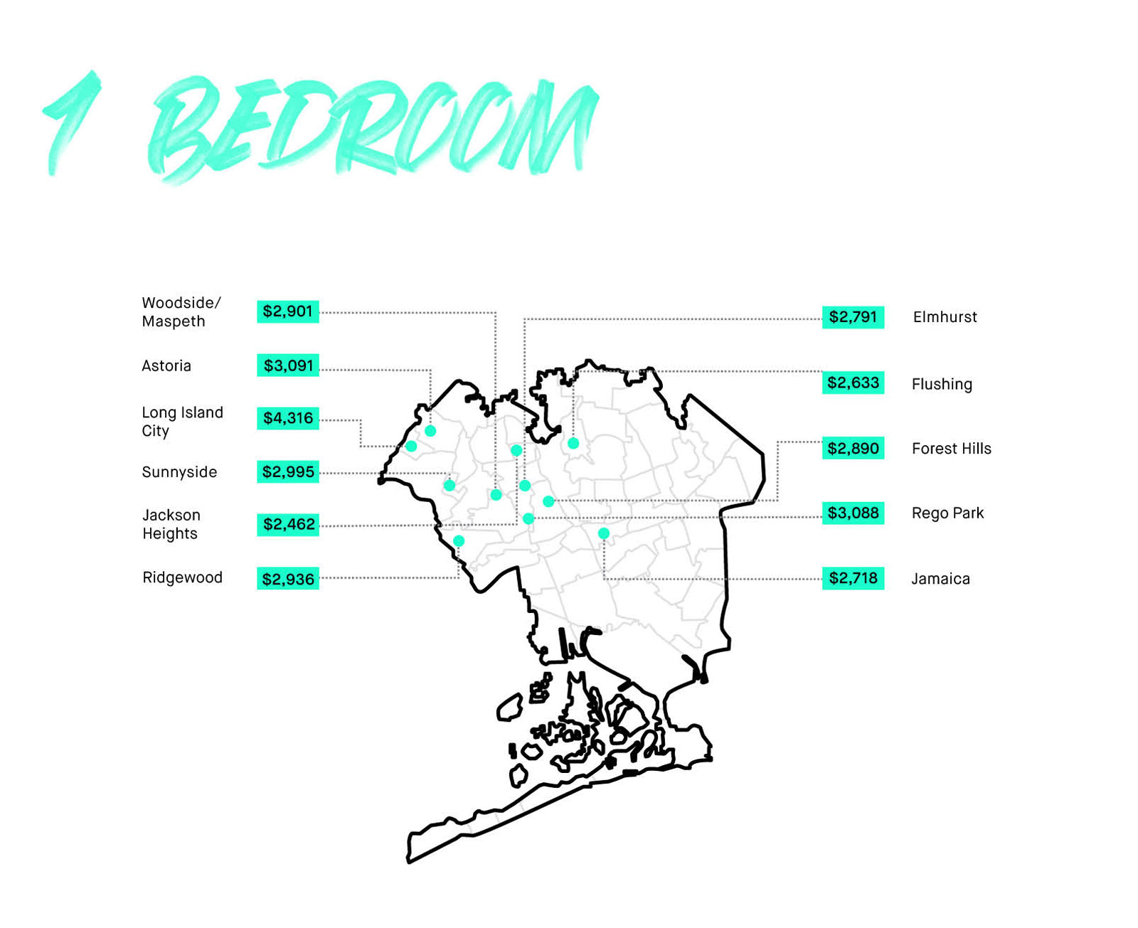 | One bedrooms | Long Island City $4,316 | Jackson Heights $2,462 |