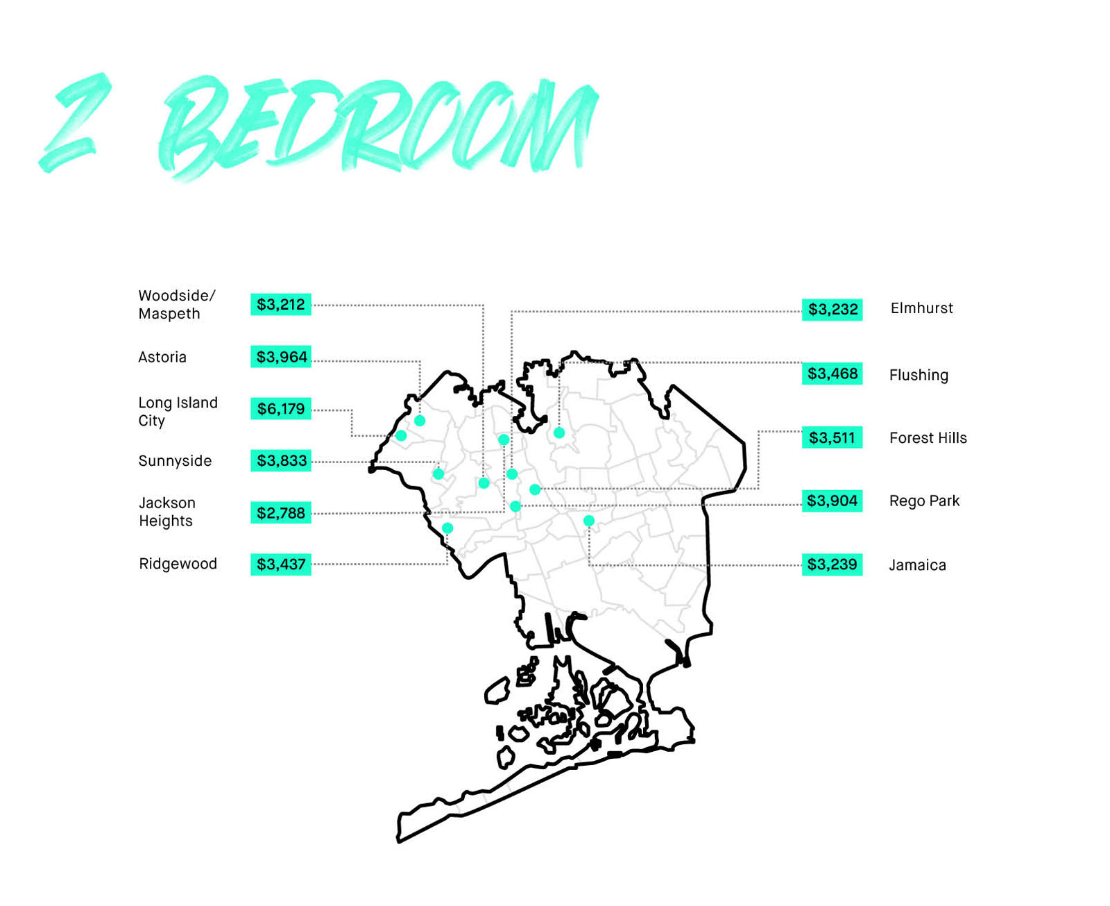| Two bedrooms | Long Island City $6,179 | Jackson Heights $2,788 |